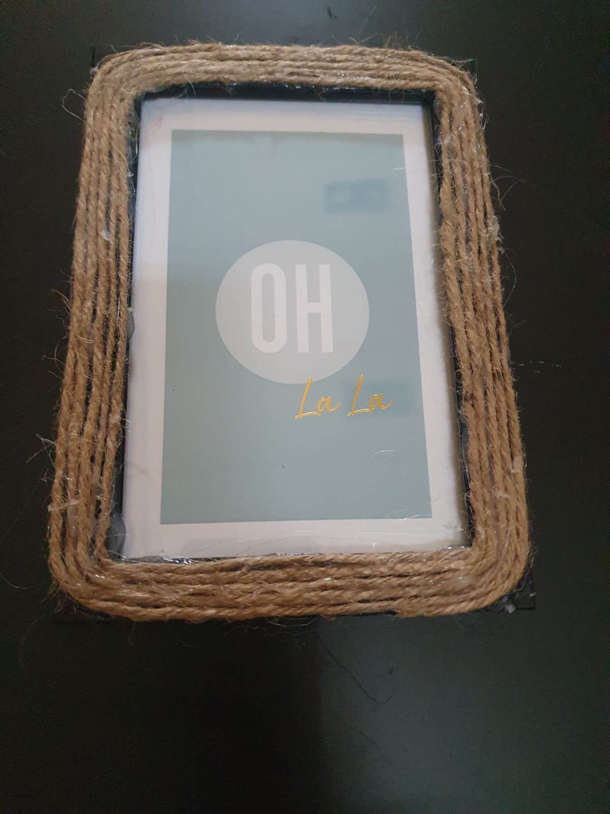 Een zwarte fotolijst waarvan de randen zijn opgefleurd met touw.