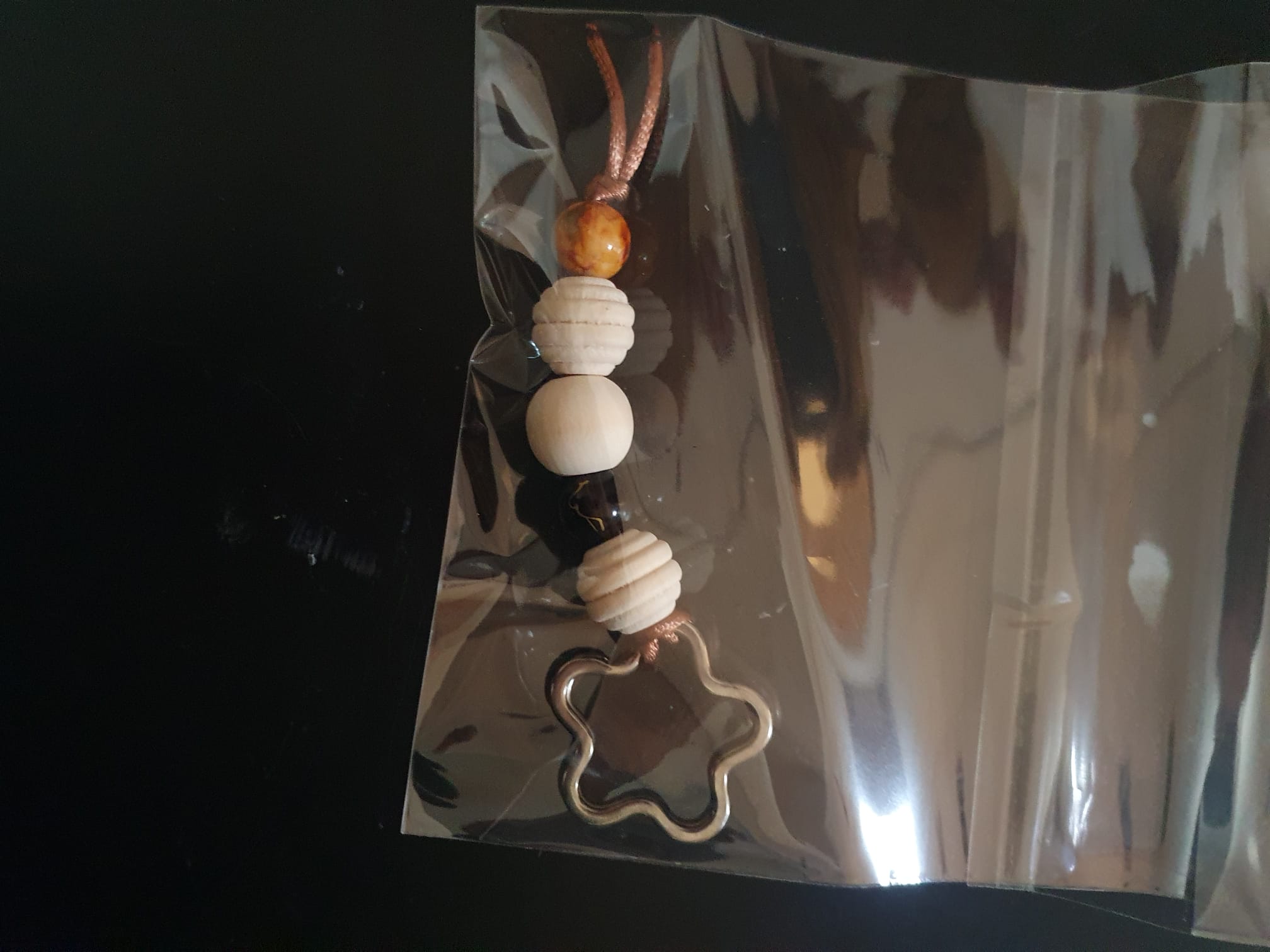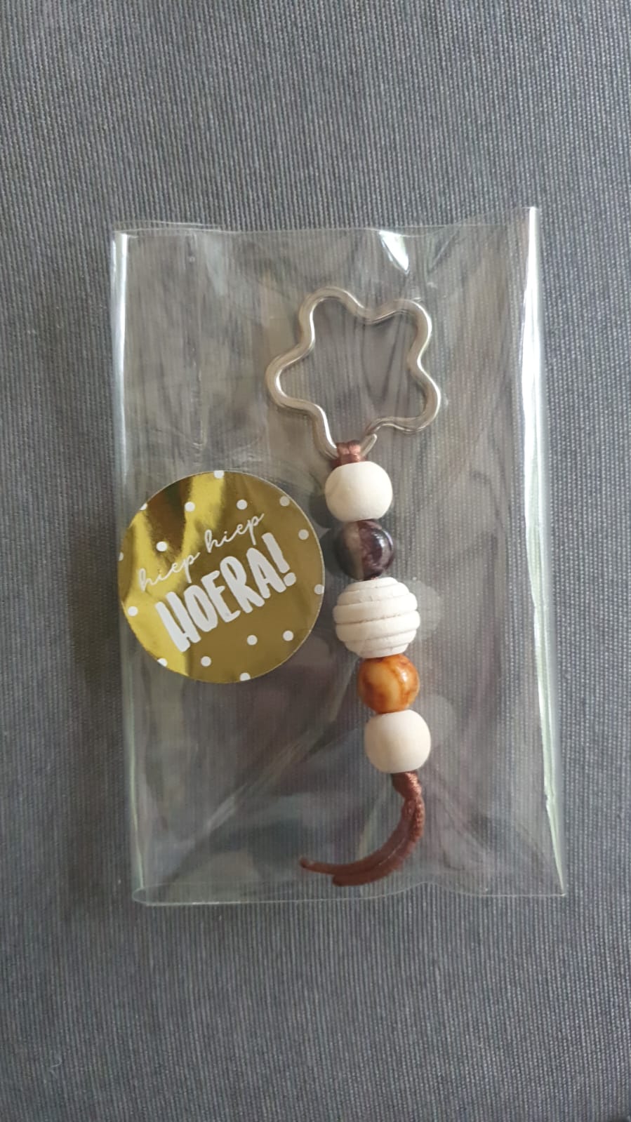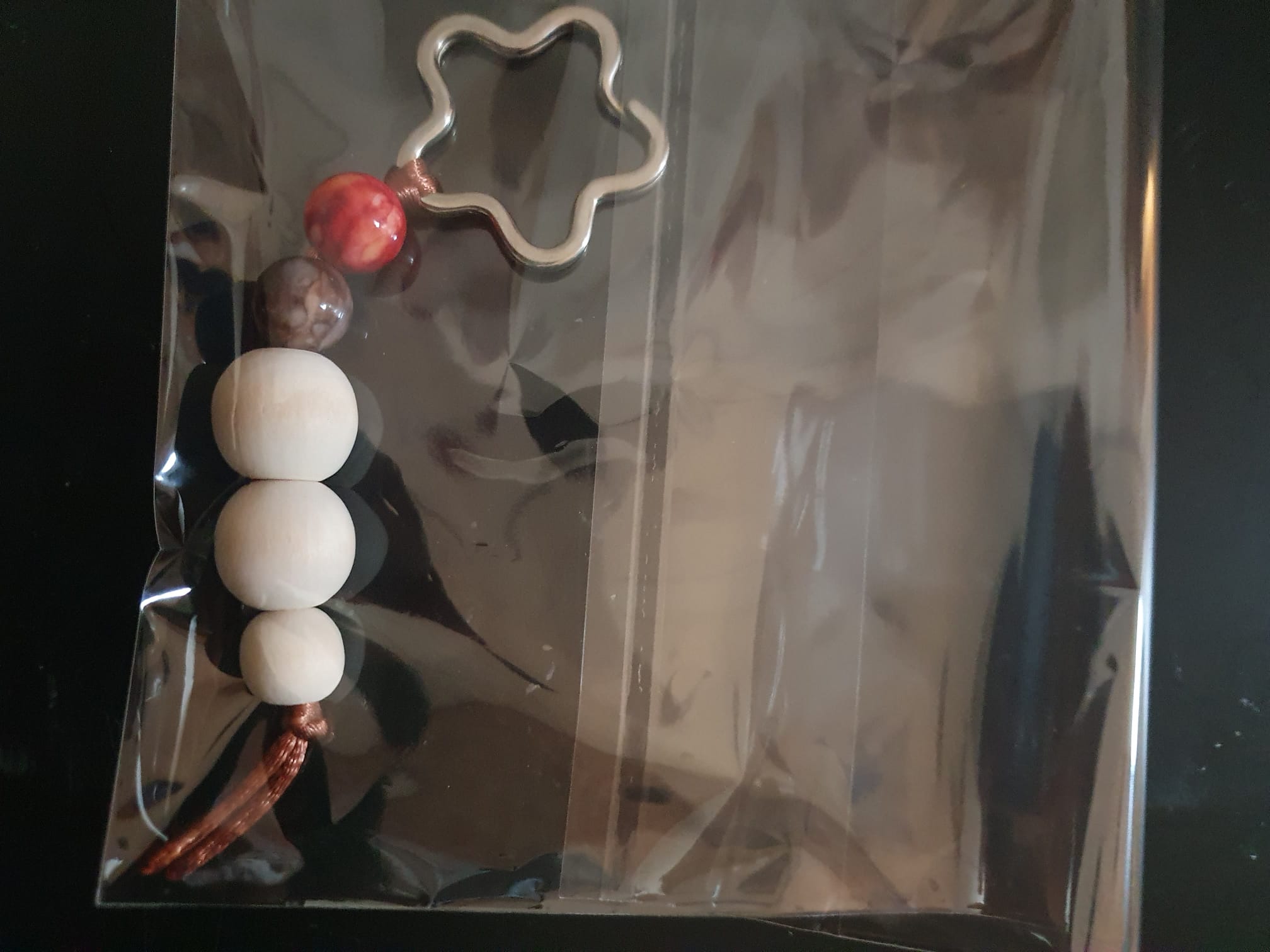 Een sleutelhanger met diverse kralen en een sterembleem.